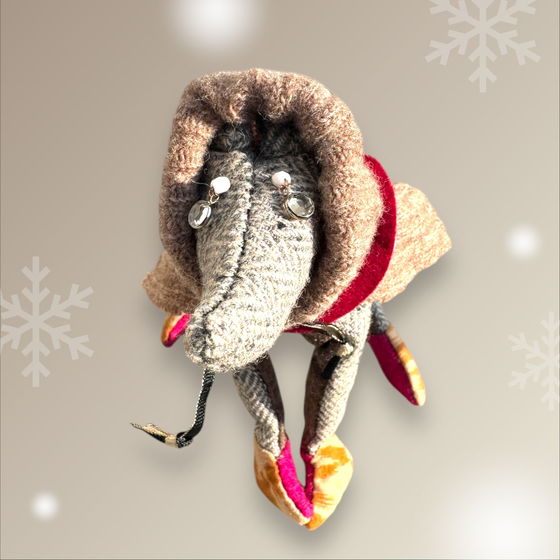 Mrs Sparkleは、イタリア製のビンテージフラノ生地で本体を作り、フード付きケープはイギリス製のニット生地。キラキラの美しいお目目はフランスのビンテージビーズ。ブーツはフランスのビンテージ生地。尻尾はフランスのアンティーク紐で。とってもヨーロピアンなIGGYさんです。