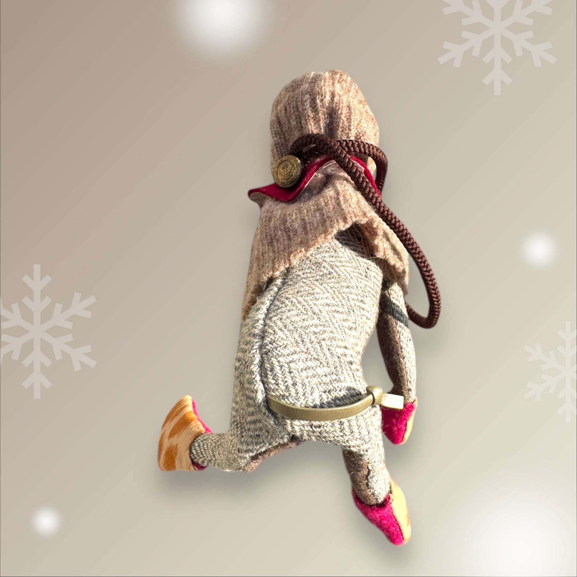 座っても、たってもとても可愛くて、味わい深い可愛さ。質の良いビンテージのニット生地のニットケープとリボン、ブーツがよく似合っています。紐がついているのでカバンにチャームとしてつけても。